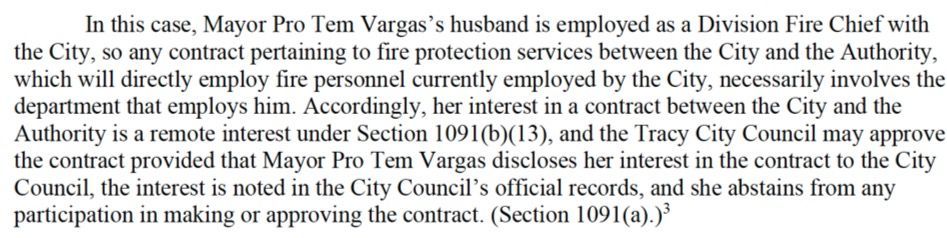 The FPPC response was that as long as any agreements didn’t result in “new or different employment for her husband” then she could participate. However, they continued by stating that “elected officials should use common sense” and that they should, “Err on the side of avoiding potential conflicts of interest, as opposed to putting oneself into the potential of an appearance of conflict.” Advice Vargas has clearly chosen to ignore in all her years as a Tracy elected official!