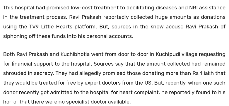 ). According to the article, Prakash and Kuchibhotla went around raising huge donations from people in Kuchipudi, promsing them a “lifetime of free healthcare” by specialist doctors from the U.S. But, according to inquiries from local officials -