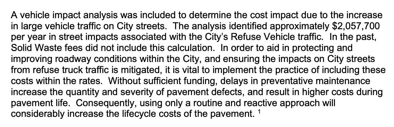Leave to a government funded report to come back with an analysis that the waste trucks will cause an estimated $2 million of annual wear and tear on our city streets. There are a several issues at play here.