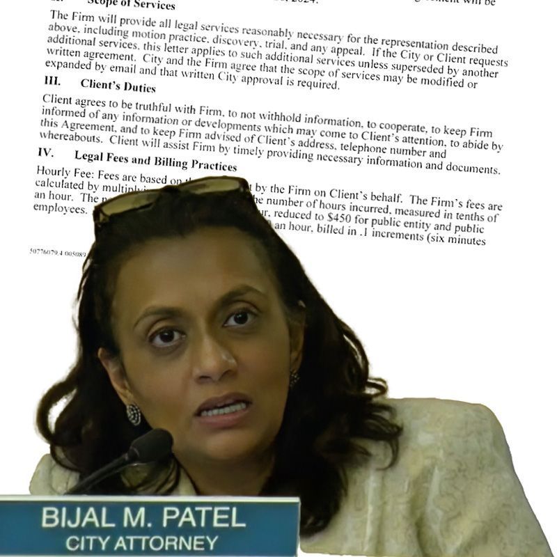 Third, why does Bijal Patel get the high-priced law firm charging $450 per hour versus the law firm representing the council members that charges substantially less per hour?