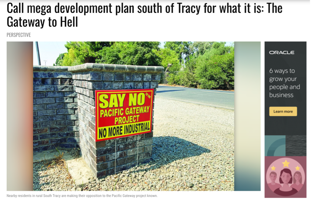 “Pacific Gateway is ‘a bomb’ being dropped on rural south Tracy to obliviate agriculture and the countryside lifestyle while providing the City of Tracy truck traffic fallout while at the same time undermining their economic future. It also will have a negative ripple effect on the quality of life in Manteca and Ripon.” The goal is to turn 1,600 acres of almond orchards and row crops into a place that can support the equivalent of eight of the Mother of All distribution centers — Amazon’s Project Big Bird."
